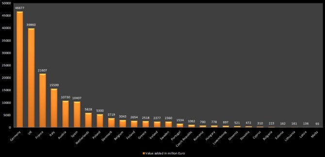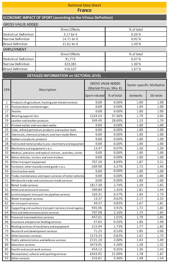 La France se classe à la 3ème place du classement des états membres. La part de la valeur ajoutée revenant au sport français dans dans le total européen s’élève à 21,61 milliards d’euros et représente plus de 416.000 emplois.